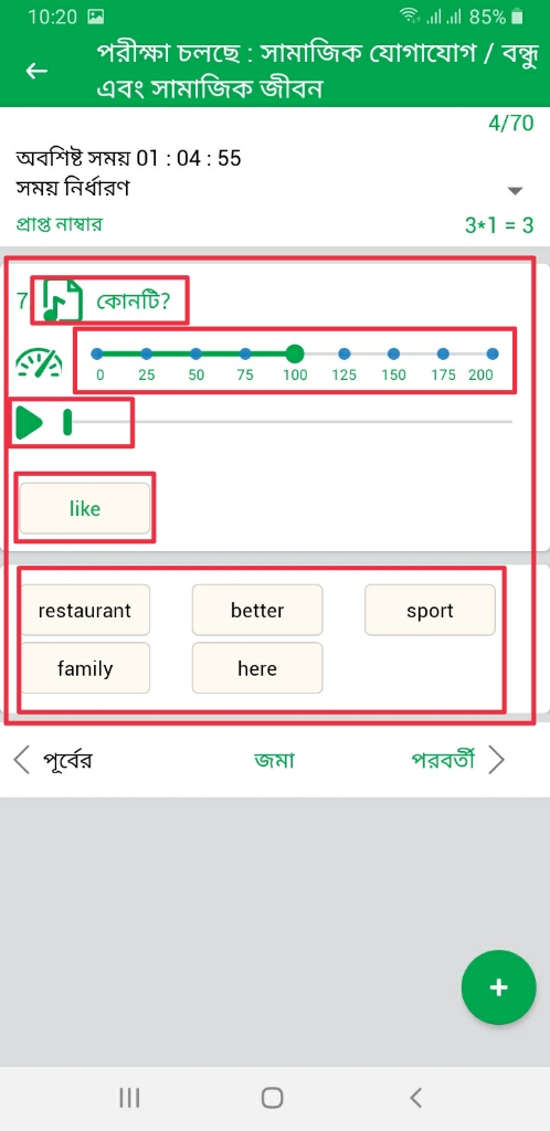 এইবার দেখুন উপরের স্ক্রিনশটের মত আরেকটি ধরন এসেছে। এখানে বলা হয়েছে "কোনটি" তো আপনাকে অডিও প্লে করে শুনতে হবে যে কি বলে। ঐ অনুযায়ী নিচ থেকে শব্দটি ক্লিক করে দিন এবং উত্তর জমা দিয়ে দিন। বলে রাখা ভালো আপনি চাইলে এখানে অডিওর গতি বাড়াতে বা কমাতে পারেন। সাধারণত গতি ১০০ দেওয়া থাকে।